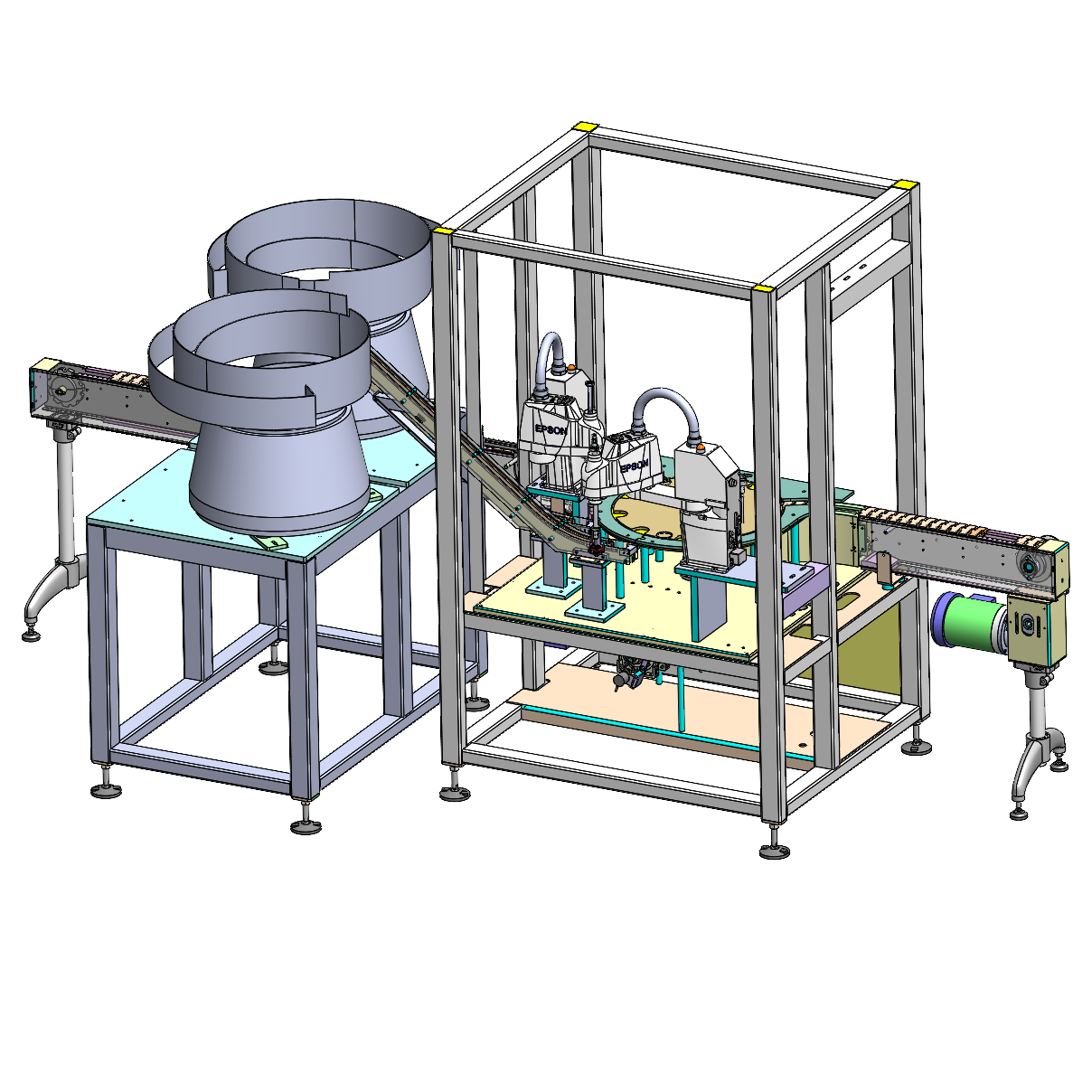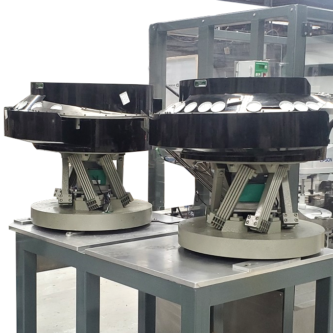 The machine is equipped with vibratory bowl feeders to ensure accurate, repeatable sorting and orienting of lids.
