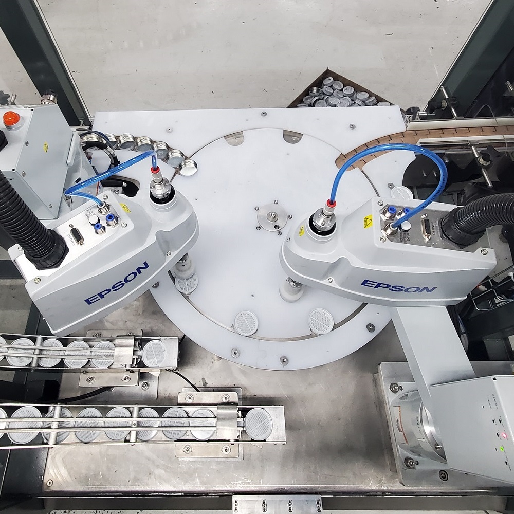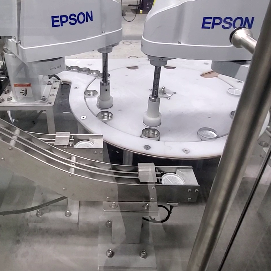 This capping machine is equipped by robots to pick and place lids on tins. The rotary starwheel displaces the tins through several processing stations. The lid feeding is organized by vibratory bowl feeders sorting and transferring the lids to the lid guide tracks.